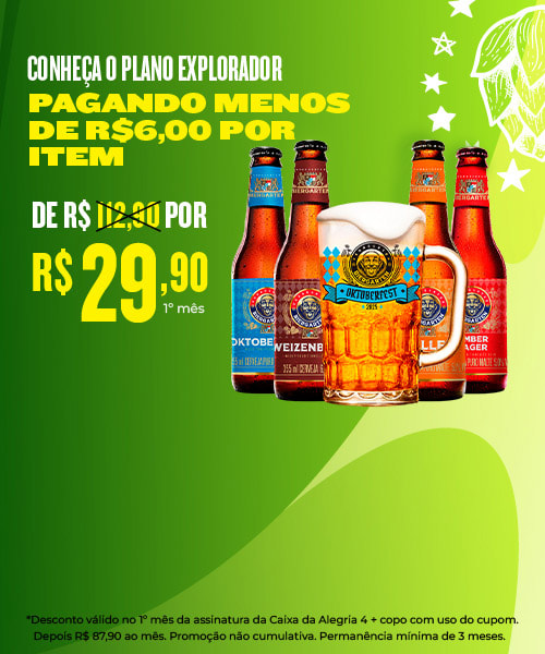 #CAIXADAALEGRIA 4: assinatura com 4 cervejas, 1 copo grátis e a Revista Nação Cervejeira, por R$ 87,90 mensais + frete (cobrança mensal recorrente no cartão de crédito - não compromete o limite do cartão).